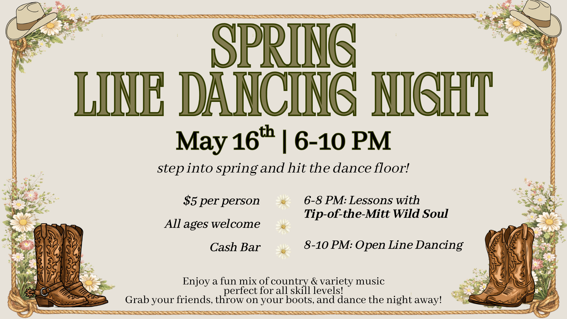 Celebrate the arrival of spring with a fun and lively evening at our Spring Line Dancing Night—perfect for all ages and experience levels. Lessons (6–8 PM): Led by Tip-of-the-Mitt Wild