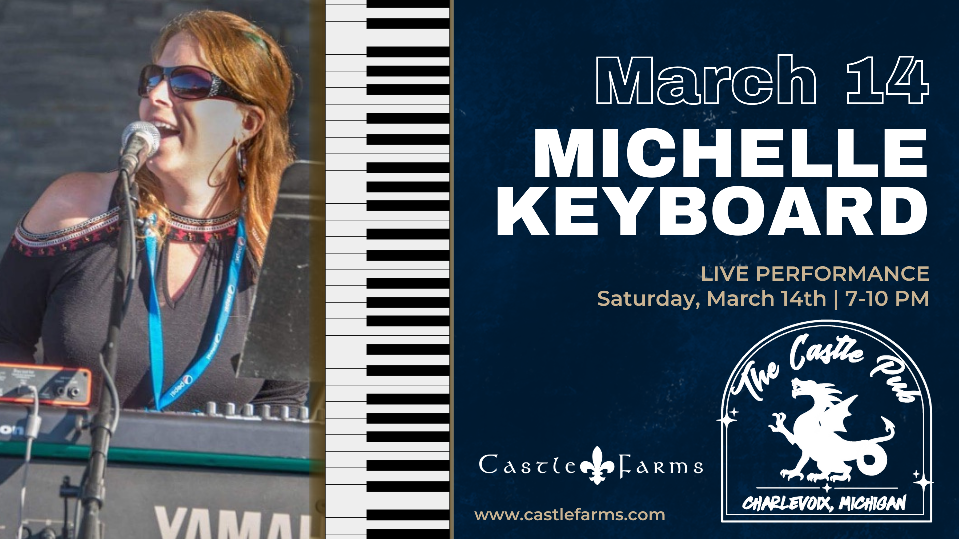 Enjoy an evening of live music in the cozy, historic atmosphere of the Castle Pub featuring Michelle Keyboard. Known for her engaging style and crowd-pleasing mix of songs, Michelle brings the perfect soundtrack for a relaxed night out—whether you’re stopping in for a drink, gathering with friends, or winding down after a day at the Castle. Grab a seat, sip your favorite beverage, and enjoy live music in one of Castle Farms’ most intimate settings.