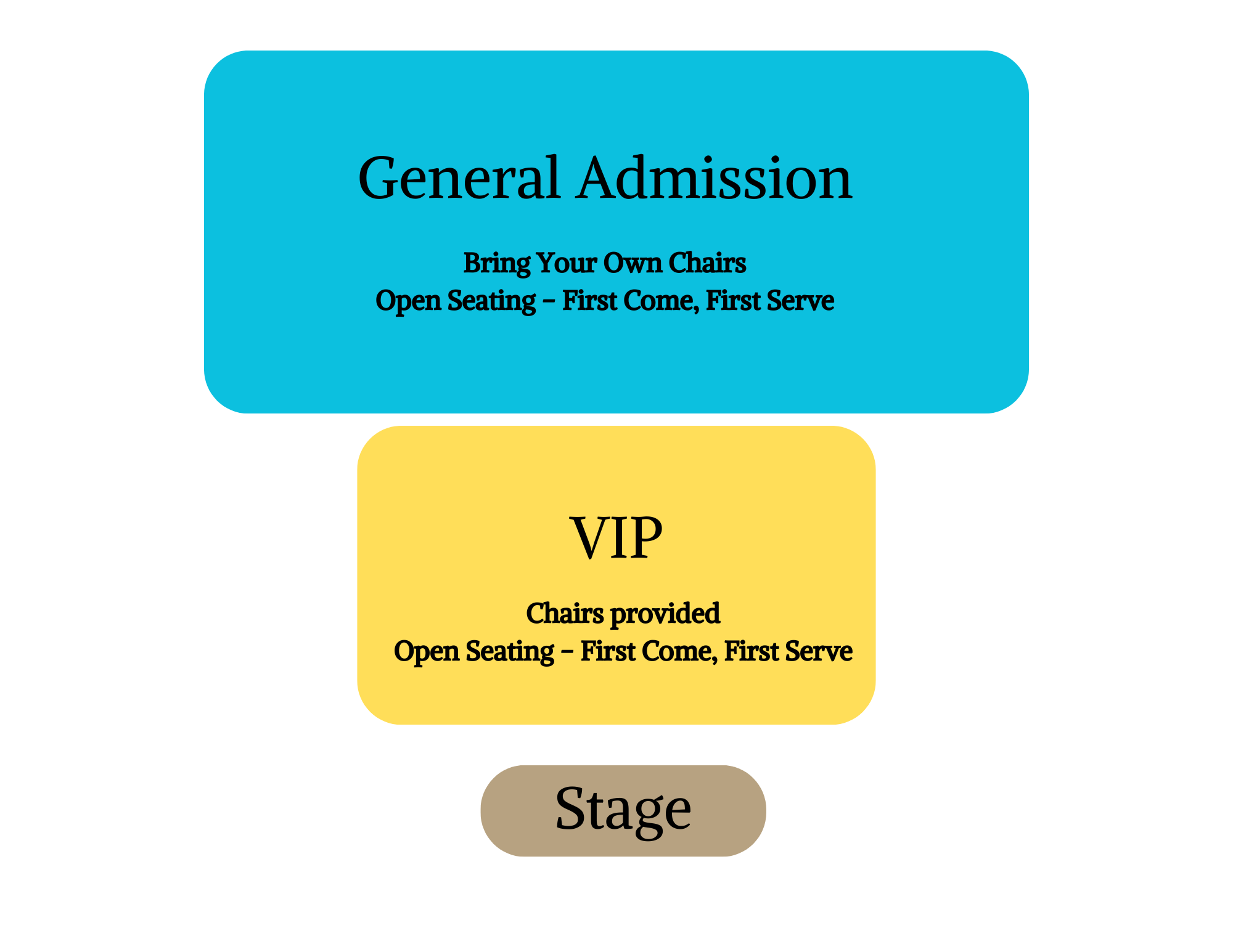 • VIP: $75 | Includes closer seating, in a reserved section with chairs provided and exclusive access to the VIP-only bar. Open seating – First Come, First Serve!