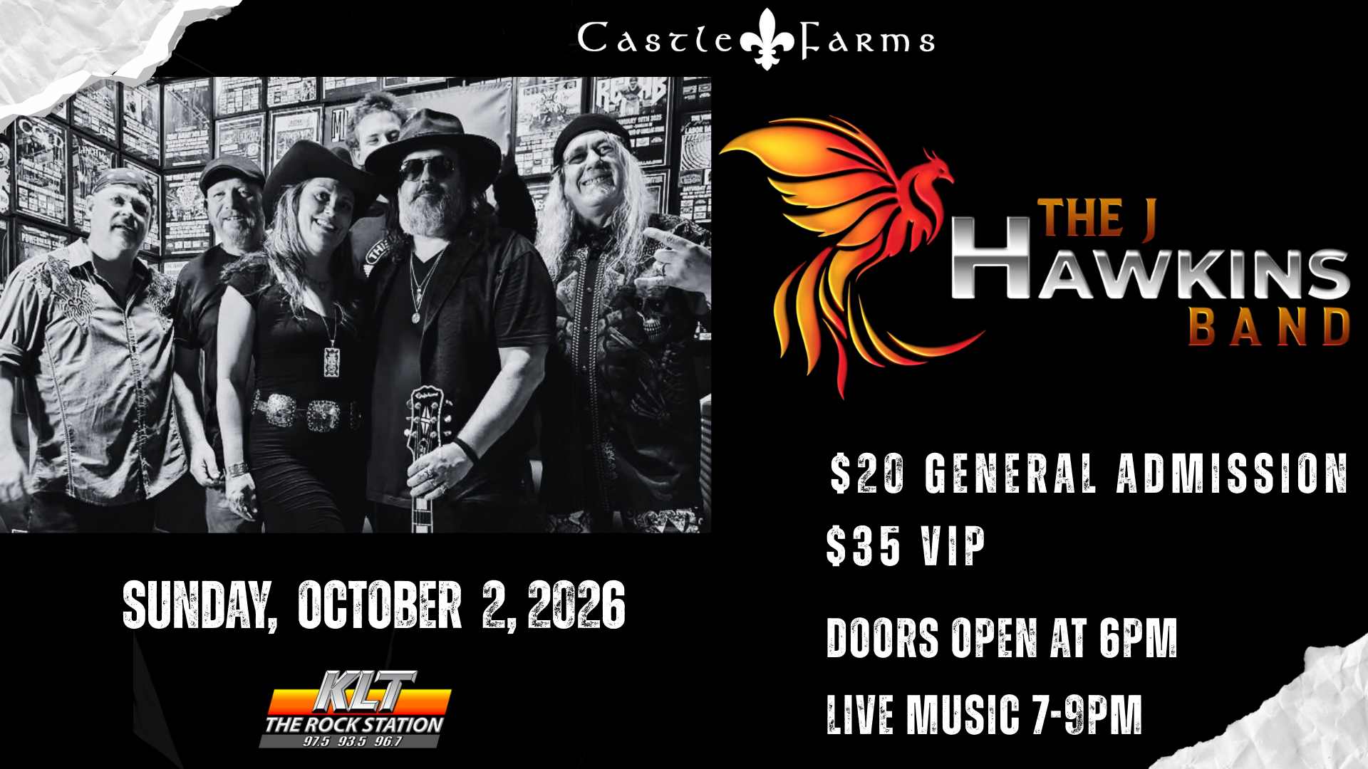 Castle Farms 5052 M66 NORTH, Charlevoix, MI, United States🎶 Live at the Castle: The J Hawkins Band Friday, October 2 | Indoor Concert Experience PURCHASE TICKETS Join us for an evening of live music, drinks, and Castle vibes as The J Hawkins Band performs indoors at Castle Farms. Start the night early with a relaxed pre-party in the Castle Pub, then head into