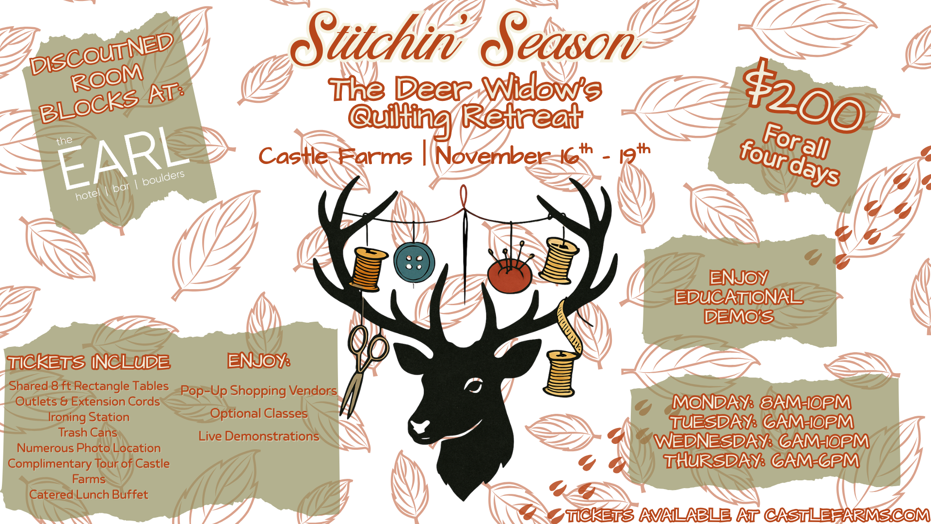While the hunters head into the woods, it’s time for the quilters to head to the castle! Join us for Stitchin’ Season: The Deer Widow’s Quilting Retreat, a four-day creative escape designed just for you. Whether you’re looking to make progress on a project, learn something new, or simply enjoy a few peaceful days filled with fabric, laughter, and inspiration—this is your moment.